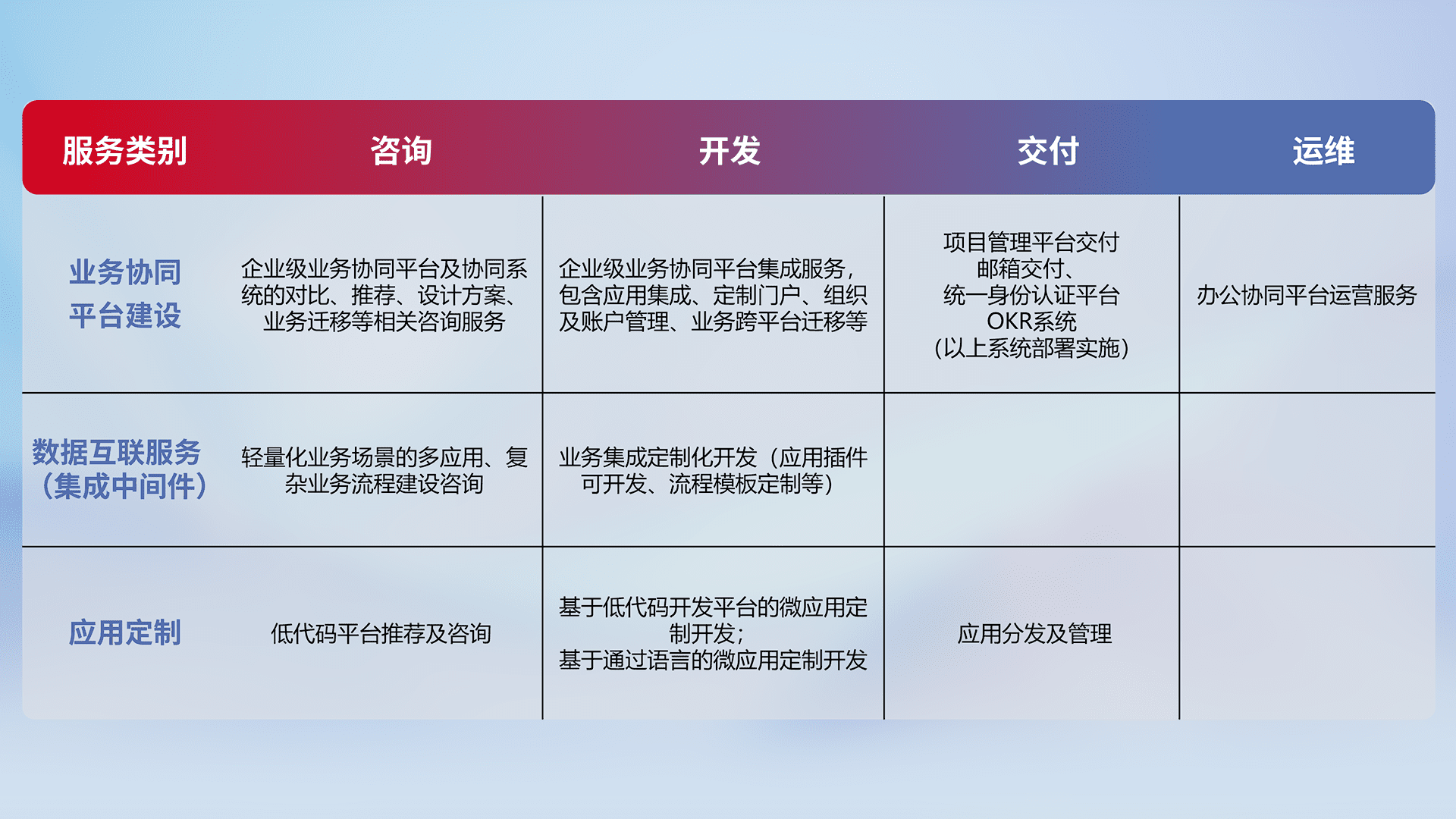 针对钉钉、、、、企微、、IDaas等平台级产品提供产品的规划、、方案、、交付、、、定制化开发等服务,,,实现如统一协同办公、、智能客户服务、、、、混合会议管理、、智能数据查询、、、、等业务场景,,,,实现数字化转型。。