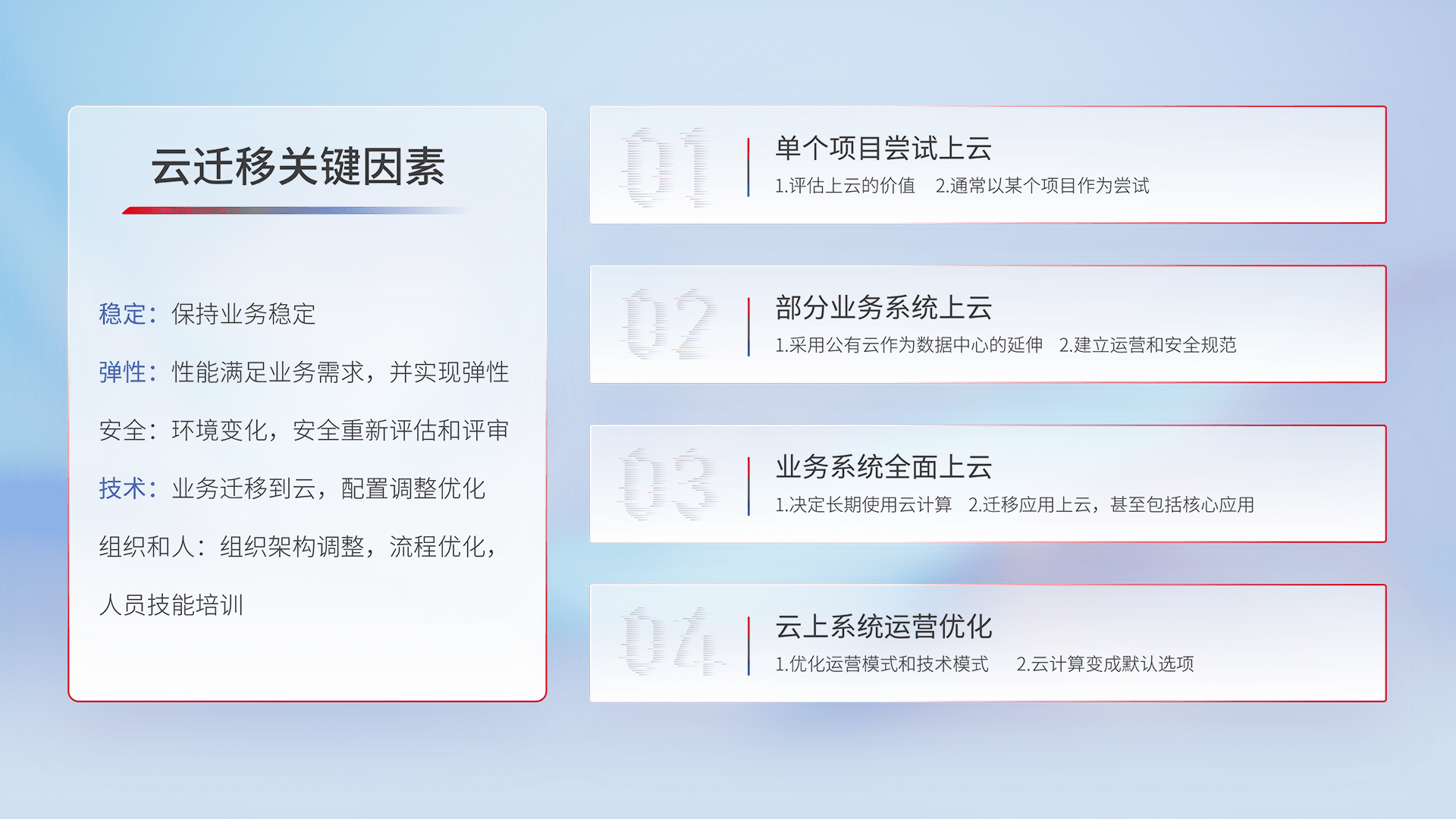 结合实际业务,,从规划设计、、、、云平台选型、、、云原生改造、、、数据迁移、、、集成交付,,,迁移全过程为客户识别最佳上云路径,,做好风险识别管理,,设计网络架构、、、身份权限、、、安全审计合规、、、、操作审计、、、、日志审计、、监控告警策略、、、、多站点容灾设计等,,,,对云上基础设施进行整体规划,,,,提升IT治理水平,,以满足弹性、、高可用、、、、高性能的需求。。。