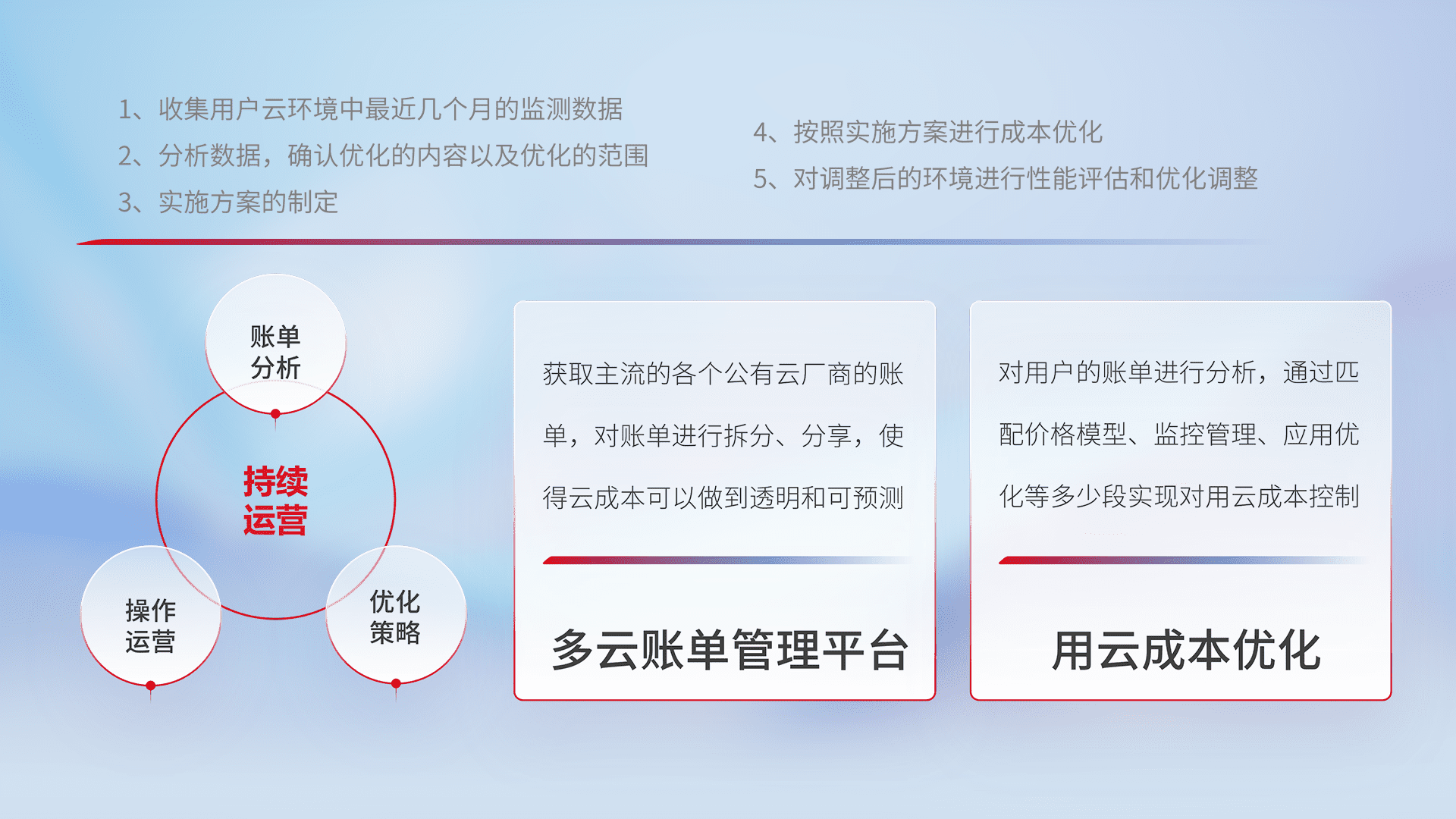 通过多云纳管,,,以统一的资源数据模型把客户的云资源进行抽象和封装,,,进而实现对多云资源的统一操作,,,,保障云资源管理的可靠性、、稳定性与可用性。。。量身定制化运维内容,,,配置、、开发运维、、补丁管理、、备份、、、监控、、、、认证和访问管理、、审计和日常巡检等,,,保障在用云过程中的可靠度,,,,稳定度以及高可用率。。。