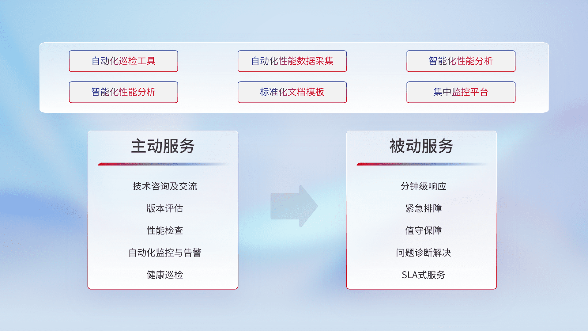 智能化工具和标准化文档,,,,保障服务质量,,,提供主动服务(包含技术咨询、、、、版本评估、、、性能检查、、自动化监控与告警、、、、健康巡检)和被动服务包含(分钟级响应、、、紧急排障、、、、值守保障、、问题诊断解决、、、、SLA服务)。。。。